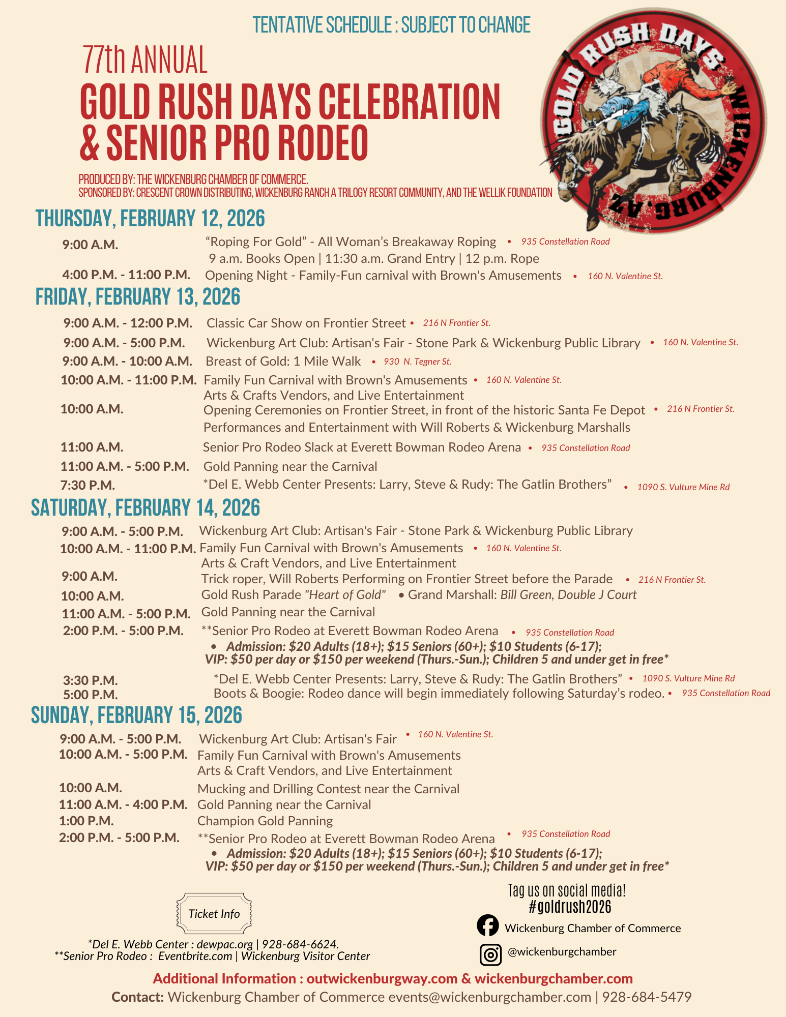 Presale tickets are available now at the Wickenburg Chamber of Commerce Visitor Center for $35. The family-fun carnival with Brown's Amusements opens on Thursday, February 12 at 4 p.m. With their Buddy Day (buy one wristband get the 2nd half off, at the carnival) Friday and Saturday, catch the carnival all day from 10 a.m. to 11 p.m. On Sunday, enjoy rides from 10 a.m. to 5 p.m.