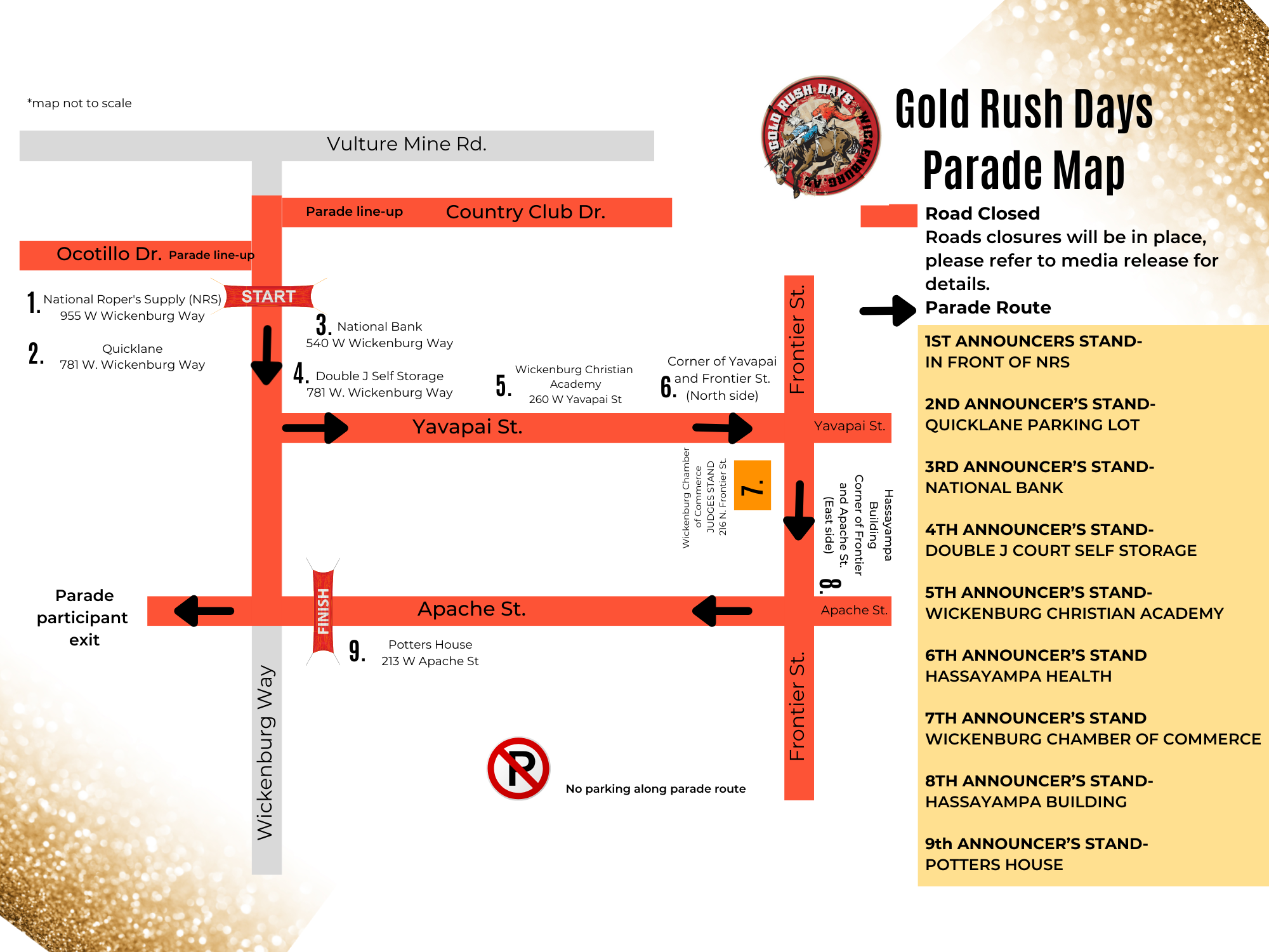 Each year, the annual Gold Rush Days parade draws thousands of spectators near and far. Over 75 entries dazzle us each year, featuring local businesses and dozens of horses within each division. Our theme this year is "Spur of the Moment". The parade will be at 10am on Saturday Feb. 14, 2025. The parade route can be seen above along with applications.